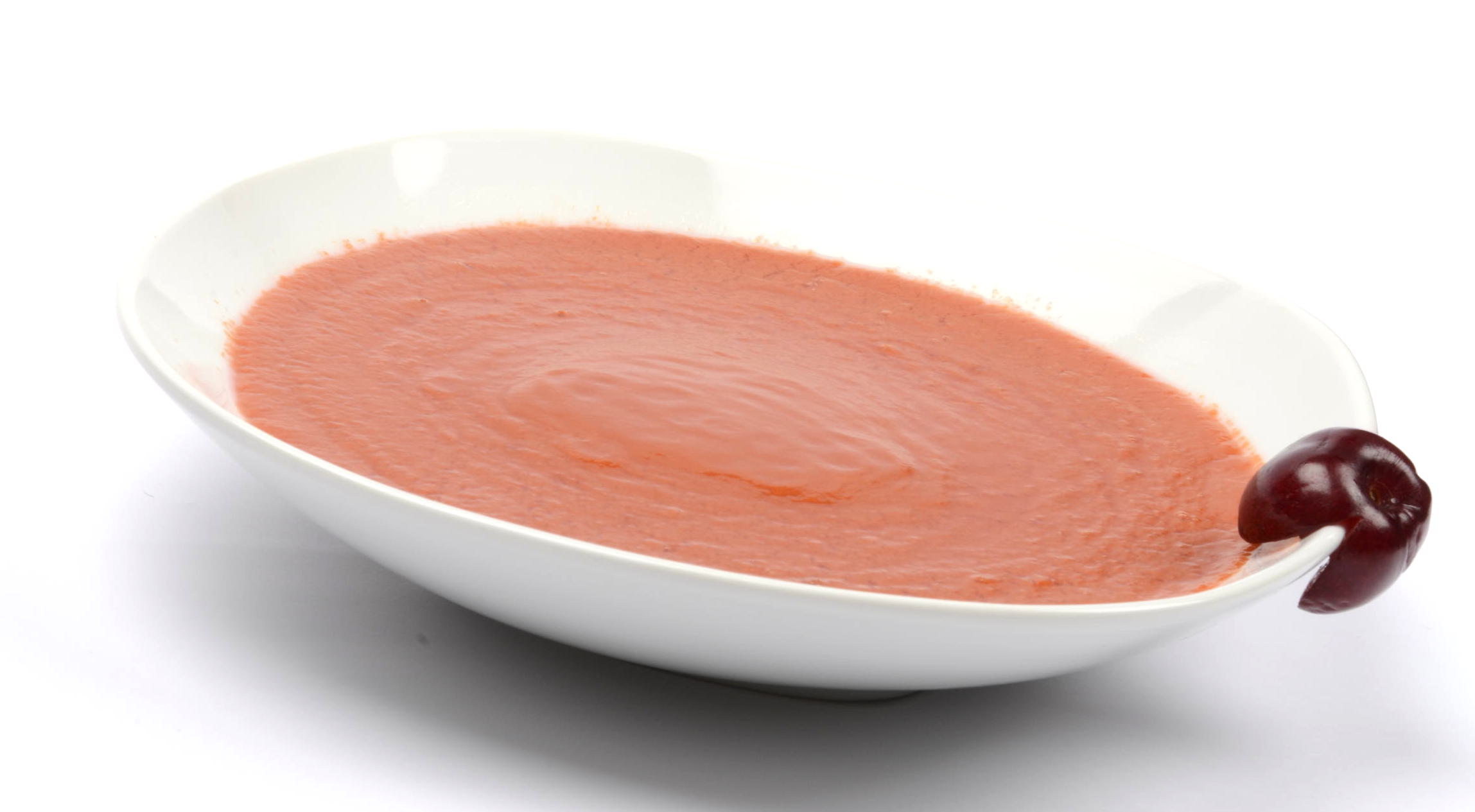 Si el tomate ya es una de las frutas más coloridas que tenemos (el tomate es una fruta, aunque muchos no lo sepan porque tiene semillas), imaginemos que además a un gazpacho le añadimos unas buenas cerezas bien maduras.