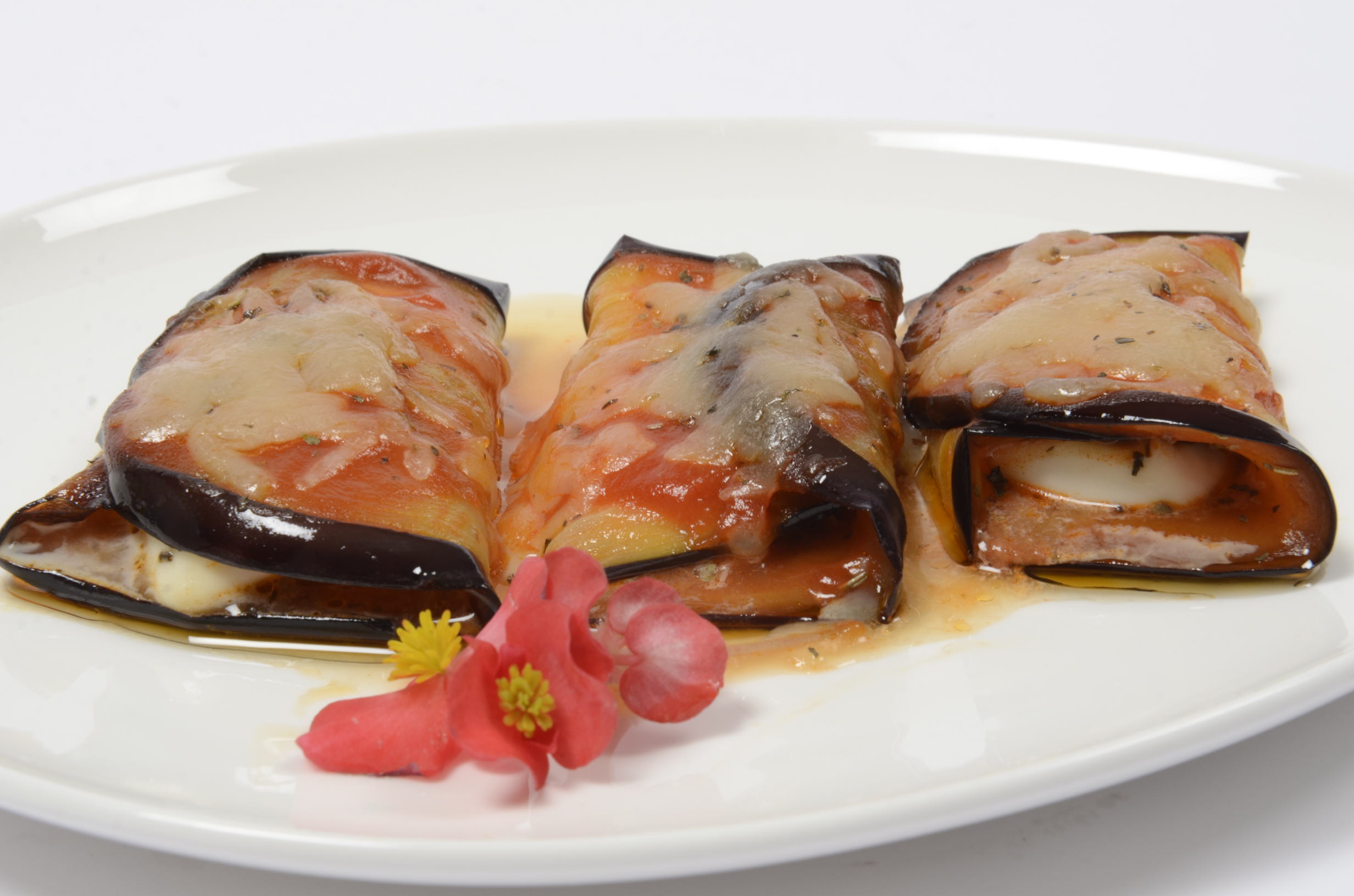 Rollitos de berenjena con mozzarela fresca y sanfaina (pisto)