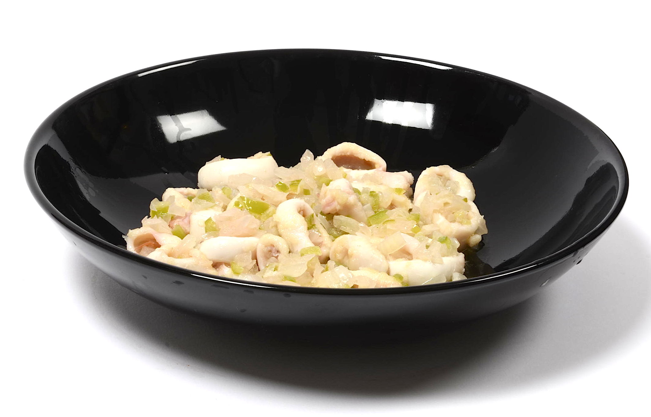 4. Corta la cebolla y el pimiento verde muy finos. Sofríelos unos minutos en el aceite SIN los calamares hasta que te quede bien pochado.