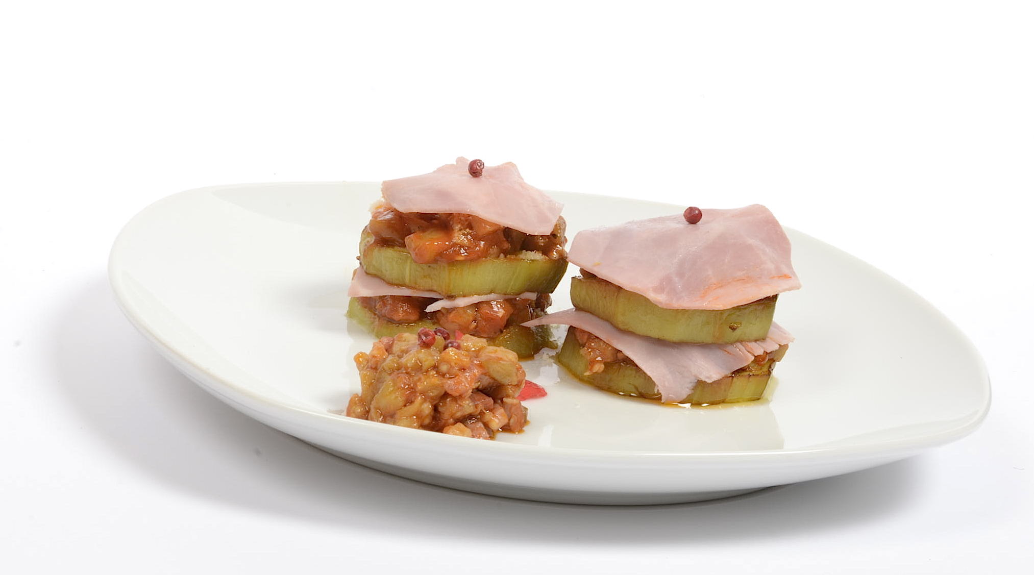 una loncha de jamón york cortada al mismo tamaño que la rodaja de berenjena